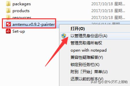 12、接着 鼠标右击amtemu.v0.9.2-painter,选择以管理员的身份运行。
