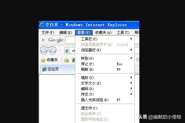 第二种:通过浏览器状态栏或工具栏中的点击 “查看”然后就用一项“查看源代码”,点击查看源代码即可查看此网页的源代码源文件。在微软IE下截图: