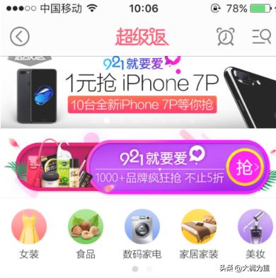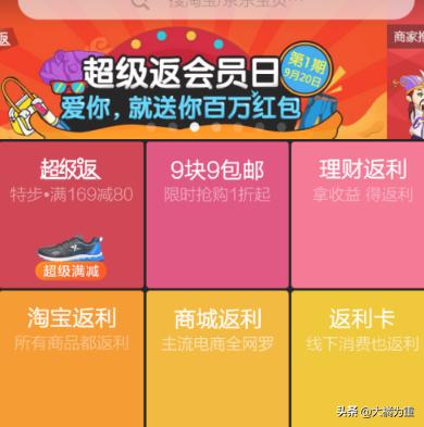 2、我以选择超级返为例,点进去之后出现如下界面:在这个界面和淘宝类似,都有各种分类,你可以根据选择进入,也可以选择搜索。